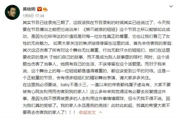 黄晓明随后回应称“家人是底线”,并于四天之后宣布退出节目录制。