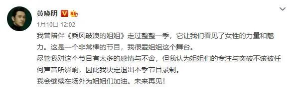 其中影响最大的无疑是,录了三期的黄晓明宣布退出《浪姐2》。