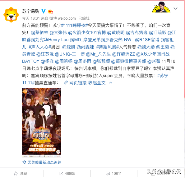 百说不如一看,谁家的爱豆自行领取,11月10晚19:30《2019湖南卫视苏宁易购11.11嗨爆夜》约定你,嗨爆双十一不见不散!