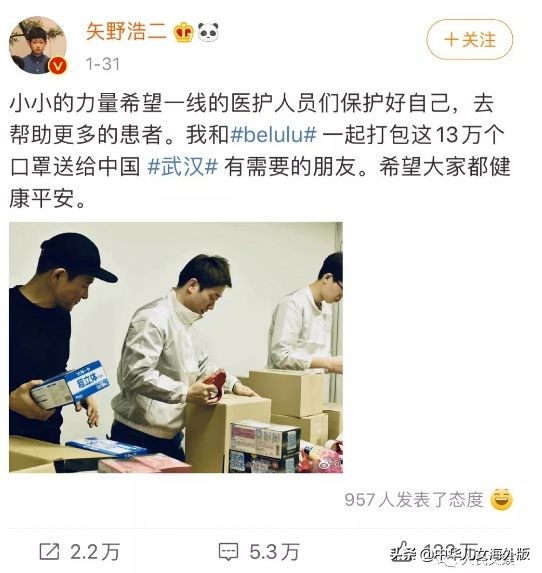 1月31日,日本演员矢野浩二发了一条微博。照片中的他,正在和工作人员一起打包口罩。