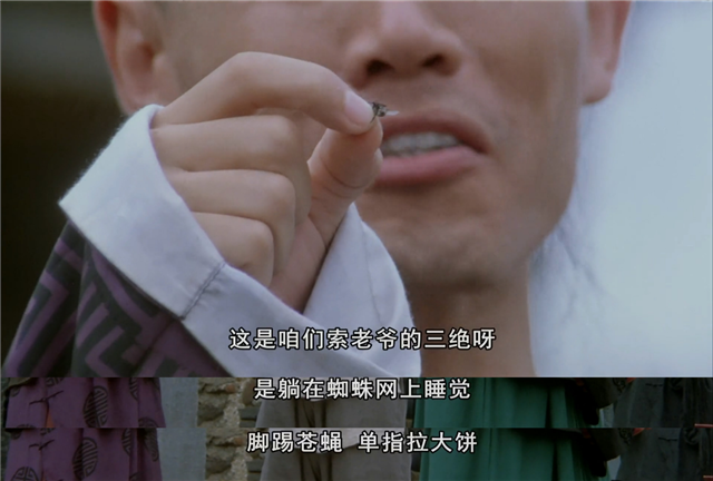 玻璃花不甘心,又请来了津门武林“宗师”索天响,仙风道骨,鹤发童颜。玻璃花向傻二耀武扬威地介绍“宗师”的绝活,居然是躺在蜘蛛网上睡觉,脚踢苍蝇和单指拉大饼,观众大部分大概已识破这“宗师”是一个欺世盗名的骗子,而且是个纯天津味的骗子。
