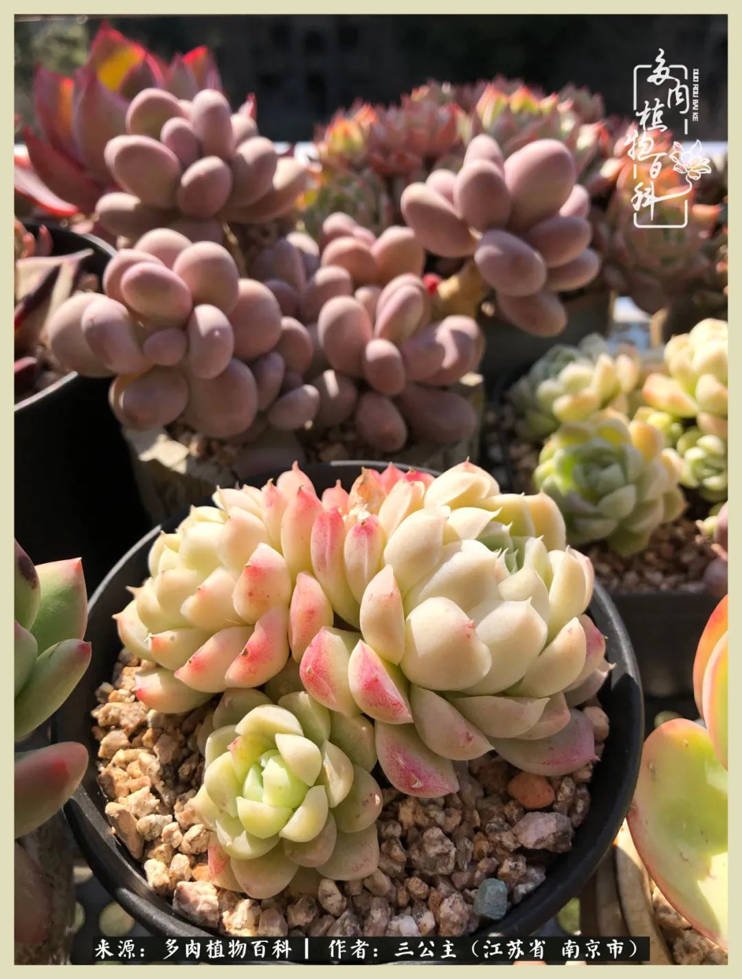 先看看桃蛋,上图是这是17年秋天入的6头,以及单头和双头蛋,如今都爆头了。看着那些冒出来的粉粉嫩嫩小头就无比开心。要说桃蛋的养护经验,包邮区,夏天少浇水(我是三伏天前浇点水润润根,然后1.5个月左右不浇水),梅雨季节要避雨,三伏天要遮阳。刚刚度过一个夏天的桃蛋可能有点丑,也不粉嫩了,还有点瘪,但是都别怕,这是半休眠了,入秋了一瓢水或者一场酣畅的秋雨就能唤醒它,冬天天气冷了就变回了粉粉嫩嫩的了。但是包邮区的秋老虎要小心哦,我之前就有肉安全度夏了,却死在了秋老虎上。(桃蛋图片拍摄于2021年5月初,苹果x原相机无滤镜)