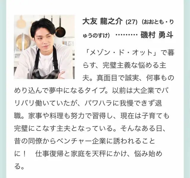 之后,神谷结识了公寓里的另一位家庭主夫——小宫谦太郎(稻叶友 饰)。