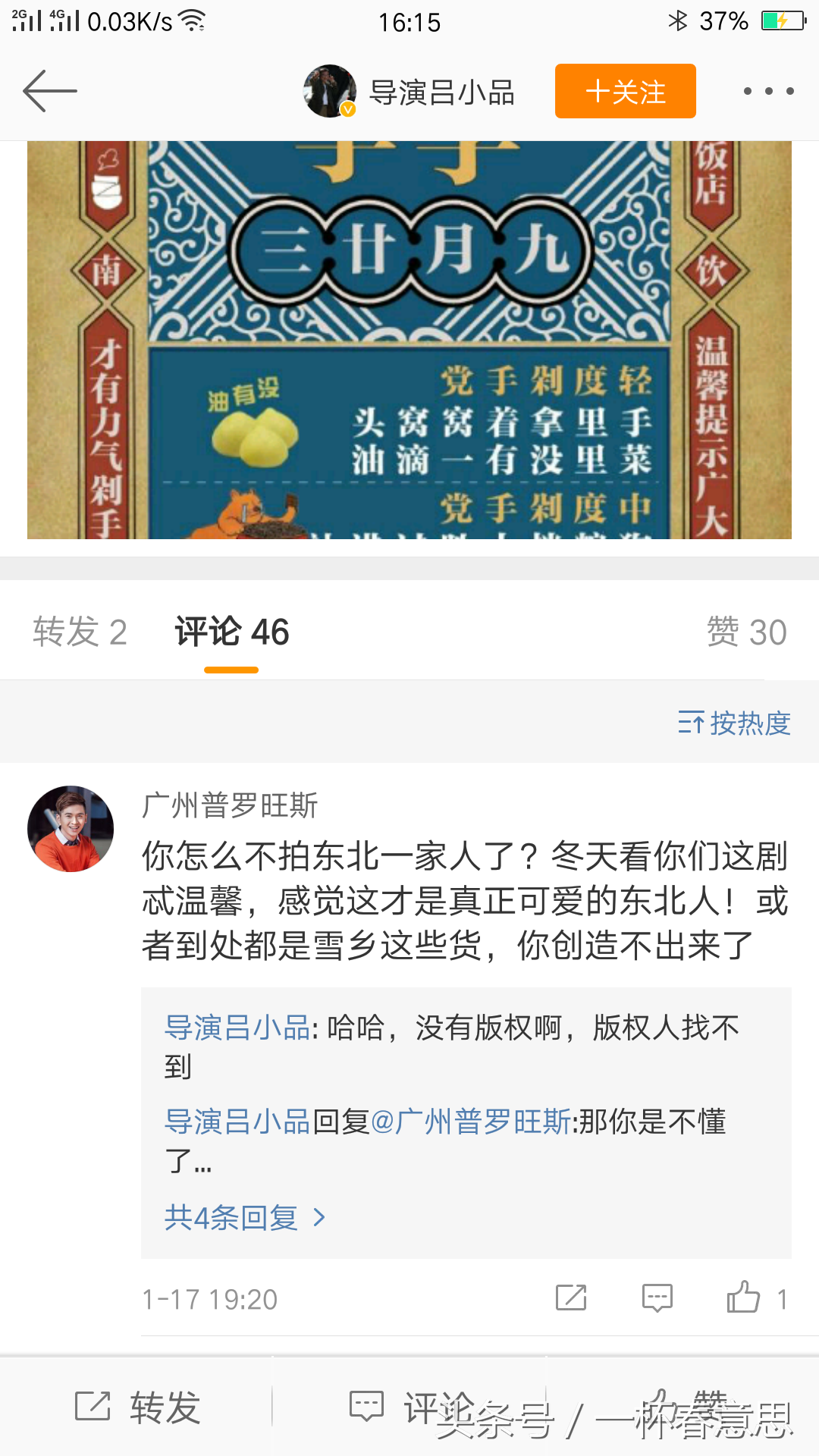 吕小品的微博粉丝只有一万多人,有网友在他的微博下留言,让他去拍《东北一家人》的续集,他无奈地回应道:想拍,但是没有版权。