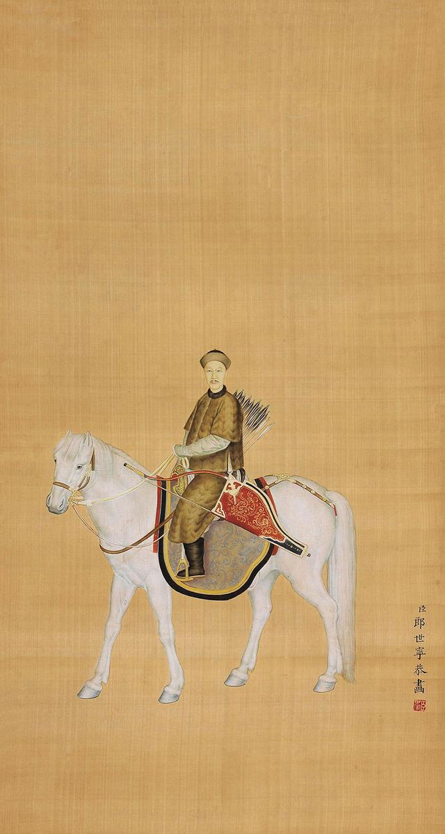 他曾经参加了圆明园西洋楼的设计工作,极大地影响了康熙之后的清代宫廷绘画和审美趣味,这个意大利人叫郎世宁,康熙年间来到中国成为宫廷画师,他的绘画还是受到宫廷绘画依照宋人郭熙定的原则作画:“山水画中,画山盈丈,树木盈尺,马盈寸,人物盈十分之一寸。”影响,虽然他不太认可这种绘画的理论要求,所以他走了一条中西结合的路。