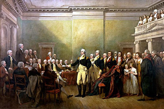 乔治·华盛顿践行当初许下的承诺,解散了他的军队,并在新泽西州的洛基山向追随了他多年的士兵们发表了精彩的告别演说。12月23日,他向邦联议会辞去了他在军队里总司令的职务,回到老家,回归田园生活。