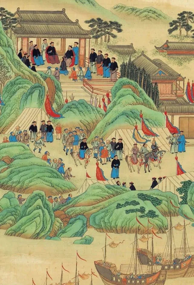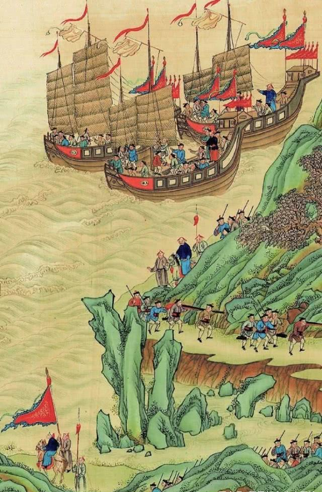 这次,张保赔了夫人又折兵,加上“卤潮蚀船,不能修葺”,无可奈何之下,唯有听取郑一嫂的意见,走郭婆带的老路。同年四月,张保接受了清总督百龄的招抚。“张保归顺朝廷”这一幕也被绘录在《靖海全图》;画中可见张保头戴水师官帽,在百官面前,跪拜百龄。