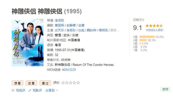 除了插曲,剧中的塑料膜瀑布、暴走夸张的雕兄,以及泡沫质感的巨蟒也处处彰显着经费的紧张。然而,即便是经费不足,95版《神雕侠侣》播出后这么多,豆瓣评分依然高达9.1分,在所有金庸剧中评分第一名。