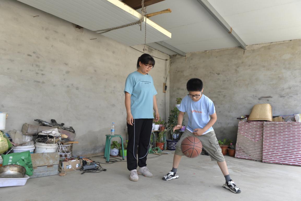 杨雨静陪着小光在院子里拍篮球。