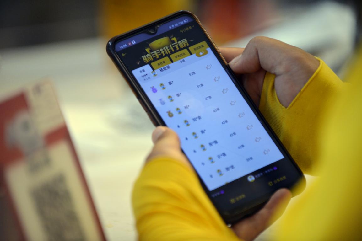 杨雨静向记者展示骑手实时排行榜,有时候也会看到自己上榜。