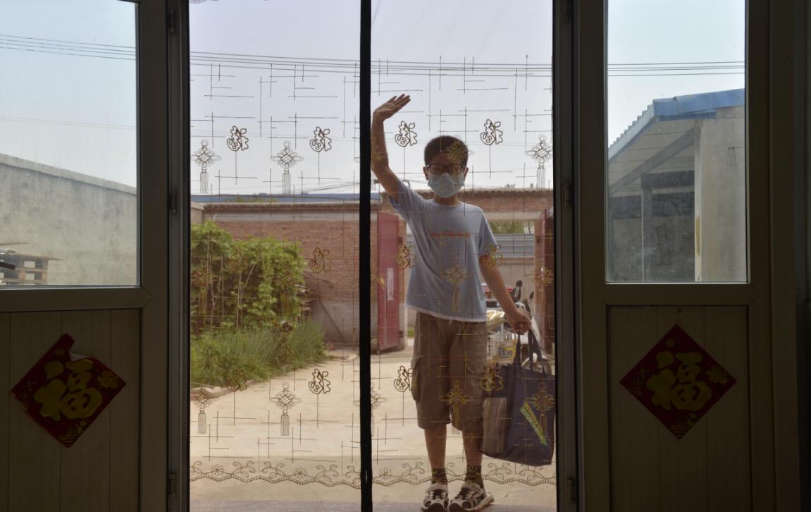 小光去小饭桌学习,出门后又转身和家人道别。