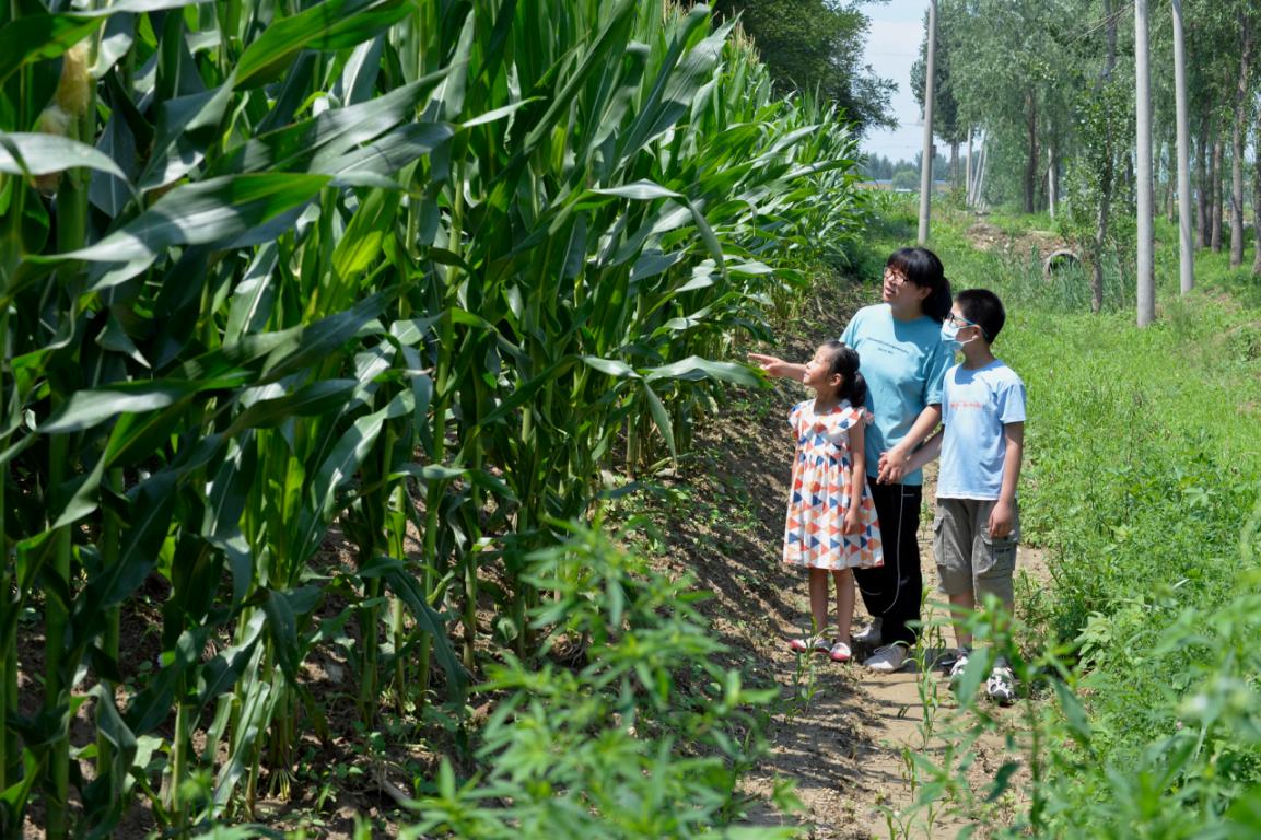 杨雨静带着小光和妹妹在玉米地。