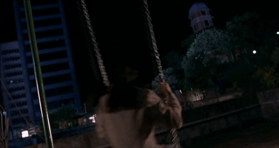 在一个楼顶,她看见两架朗做的小秋千,静泊夜色,他推她荡起秋千,越飞越高,她的长发随之扬起。