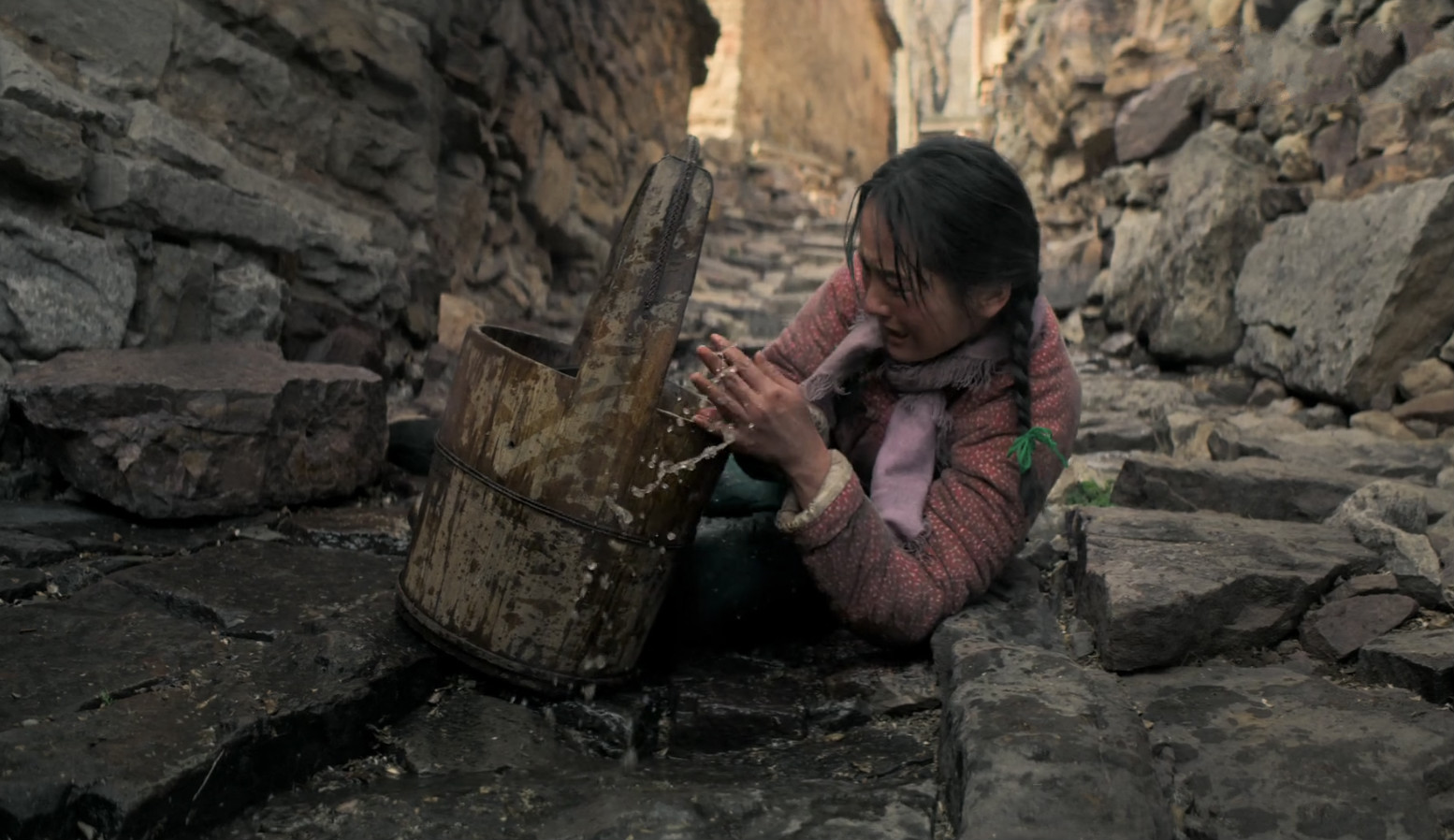 影片开头一个女人挑着水桶,走在蜿蜒曲折的山路上去挑水,画面中丝毫看不到她能在哪里能找到水源?周围不是枯树,就是漫山悬崖峭壁,还有因太过干燥随风飞扬的灰尘。