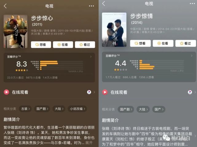别看这名字上就差一个字,可片子的质量上差得远呢。 不仅豆瓣评分有点两极分化,而且有很多网友直言不讳,说本来是冲着《步步惊心》看的,结果没想到这部《步步惊情》把原作的好口碑败了不少。