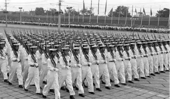 50年代末“大跃进”运动开始也是中国的转折点,而国庆阅兵大典从一定程度上正是国情国力的体现。1959年建国10周年,共举行了11次国庆阅兵,此后,连续24年没有举行国庆阅兵,直到1984年,根据邓小平的提议,中央决定恢复阅兵,并于1984年国庆35周年时举行大型的国庆阅兵式,并决定国庆阅兵式5年一小庆,10年一大庆。