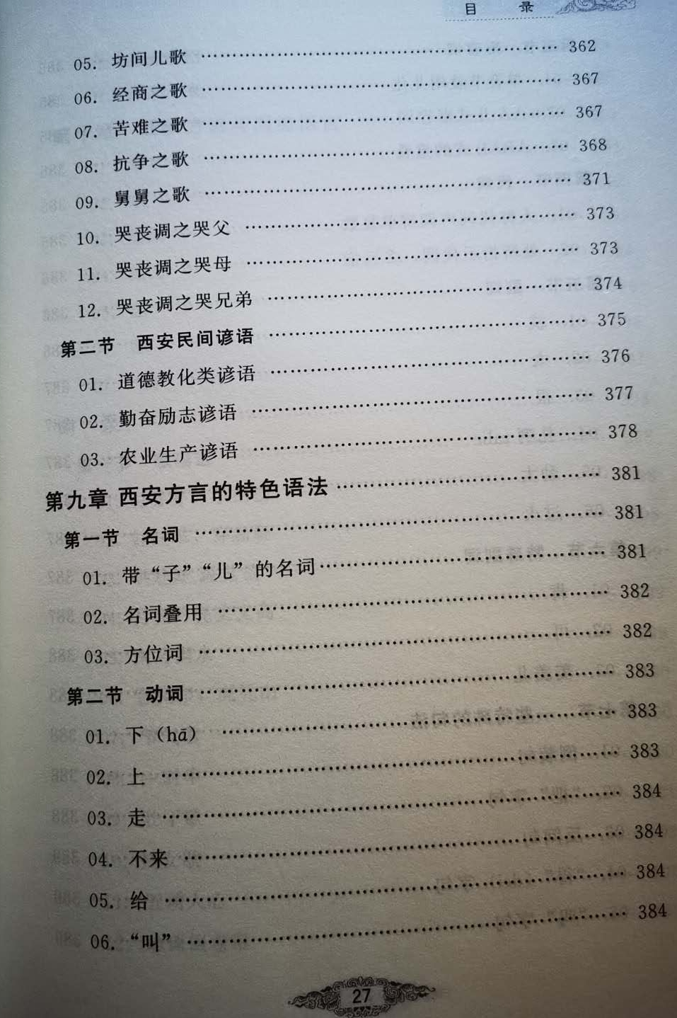 值得一说的是,作者在附录部分抢救性的列举了多段不同内容的流传在关中和西安一带的原汁原味的歌谣,这些歌谣之所以在民间广为流传,读起来朗朗上口,是与对人们熟悉的方言应用是分不开的。如“娃娃乖,穿新鞋(hai),娃娃劳捣猫咬来。猫呀猫,你别咬,咱们俩个从今好。”其中的方言词“劳捣”是调皮捣乱的意思。如谚语“有了一顿,没有了挈棍”里的“挈”是典型的关中方言,是握、拿的意思。有时候一句谚语用好一个方言字词,便具有画龙点睛的作用。