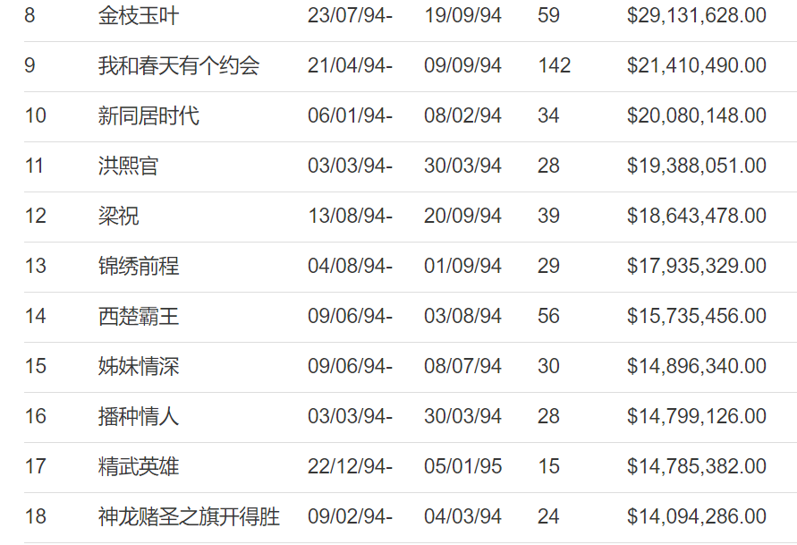 1994年12月22日,《精武英雄》正式上映,然而,这部被后世誉为动作片永恒经典的电影,却遭遇了一个滑铁卢,在香港上映15天就惨遭下架,票房只有1478万港元,只排在全年票房的第17位。李连杰的正东电影公司,也因此遭遇经济困难,被迫关门,当然,这还有其他一些原因,之后,李连杰也转战好莱坞了。