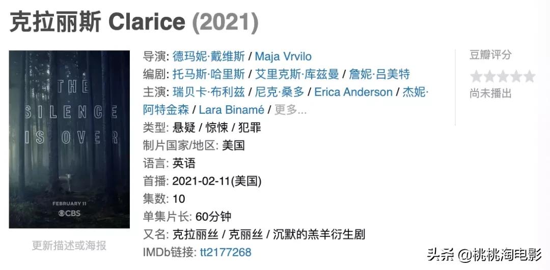 这部cbs的犯罪惊悚剧,主角就是克拉丽丝,也就是当年《沉默的羔羊》中朱迪·福斯特的角色,故事关于当初电影版《沉默的羔羊》一年之后,女主角克拉丽丝重返侦探工作,继续她的连环杀手追捕之路。