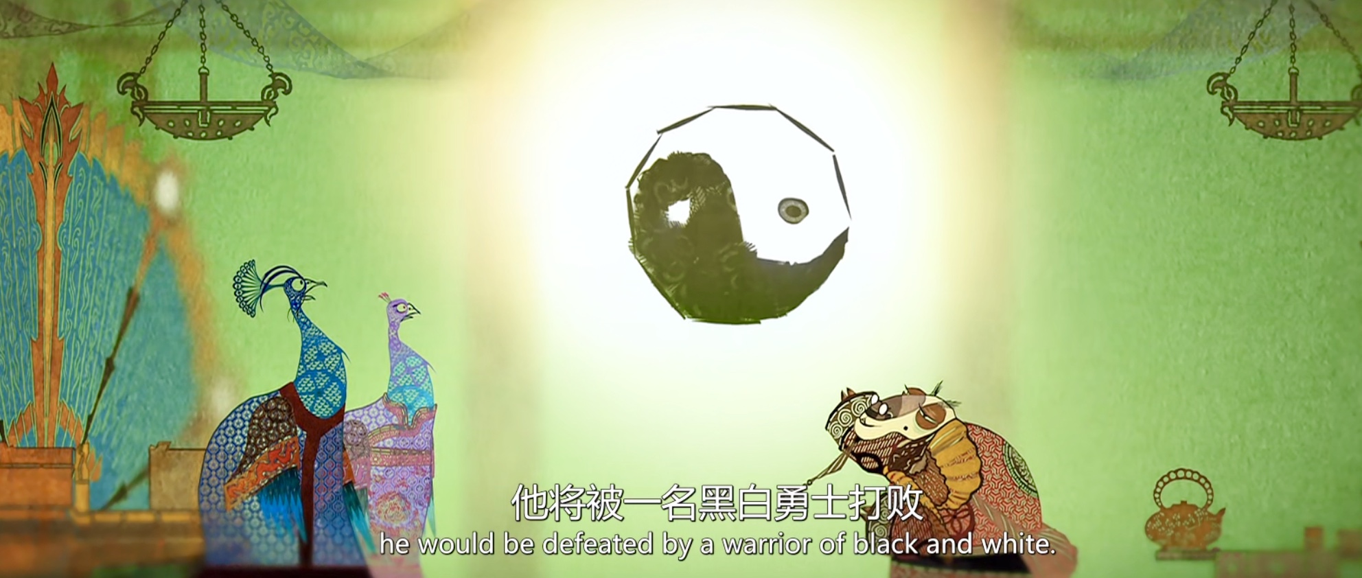 反观孔雀沈王爷,他面对烟花,起了邪念,做起了炮火实验,这导致他的父母请羊仙姑来算卦,而他对预言的反应又导致他的屠杀熊猫行为,他的这一残忍行径又导致了其父母将其逐出宫门,而他对被驱逐的反应导致了他日后的回来复仇。