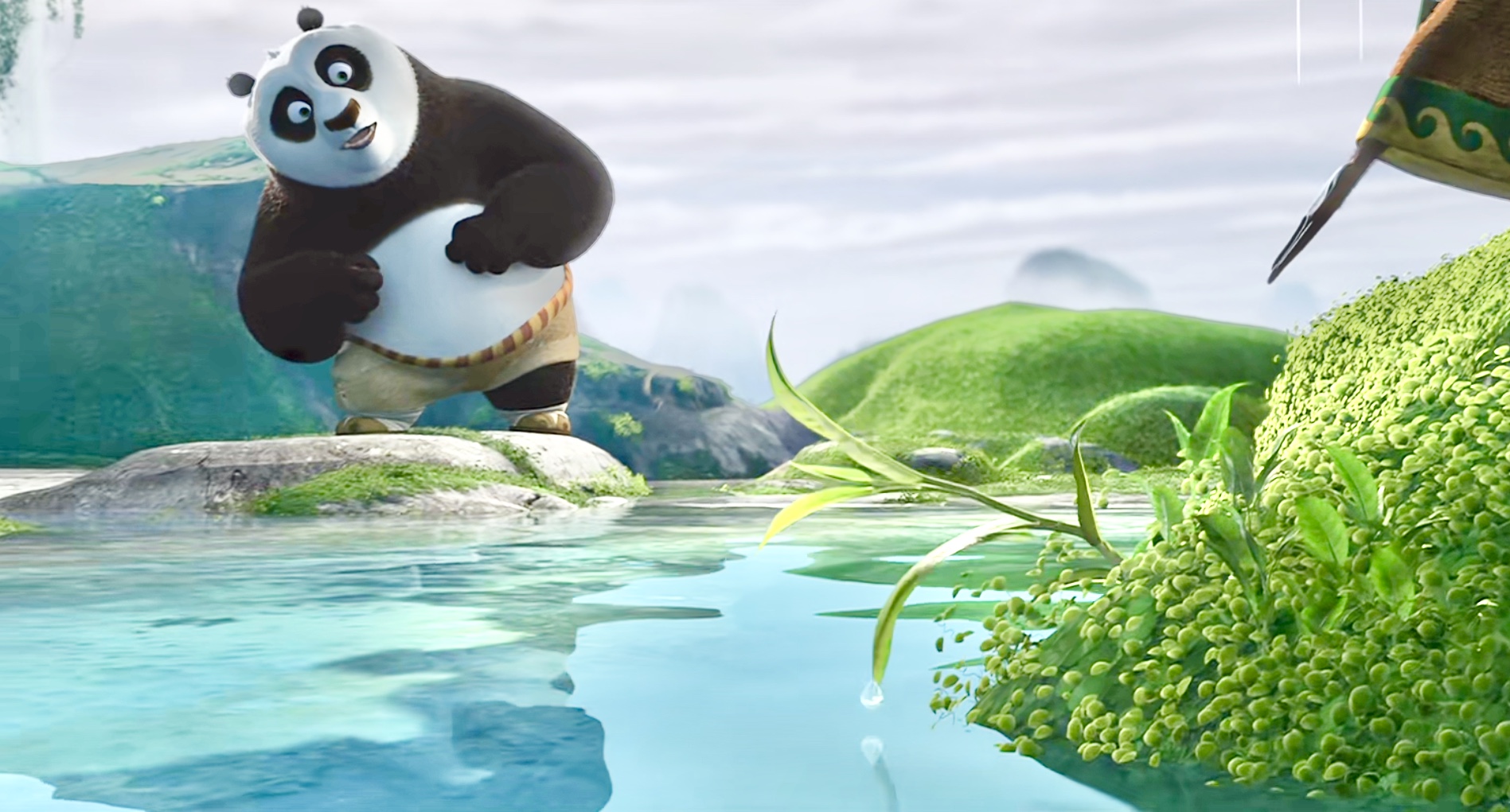 电影的开头,浣熊师傅用一滴水向阿宝展示了内在平静的力量。他背对徒弟,闭目凝神,手中圆润滚动的水珠是“心如止水”最好的诠释。 阿宝跟随水珠不断变换的视线,则可以看成是一种对“心如止水”的茫然和索求。