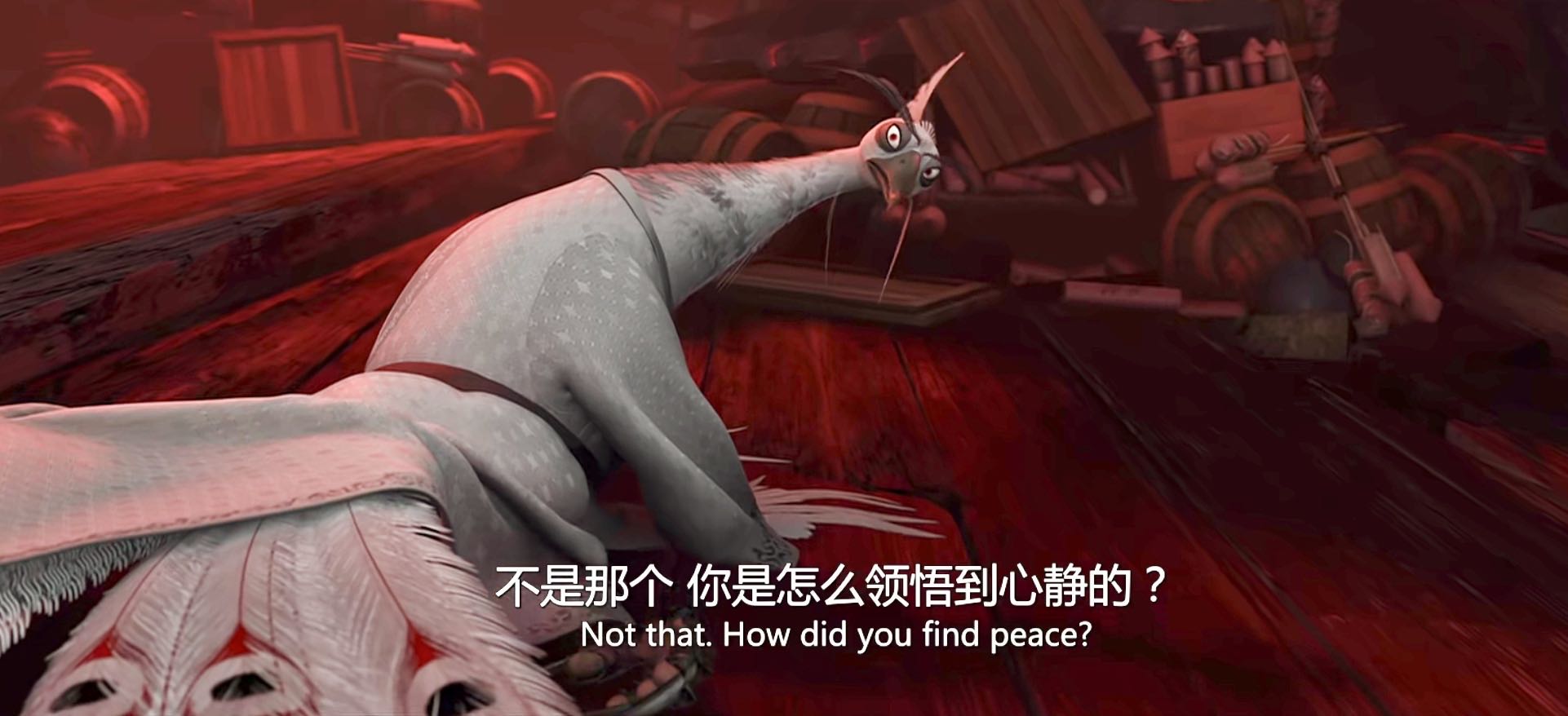 在电影快结束时,孔雀沈王爷问阿宝是如何做到心静的,自己可是杀害了他们熊猫宗族的罪人啊!他不相信阿宝会选择宽恕自己。阿宝回答道,是自己的选择。