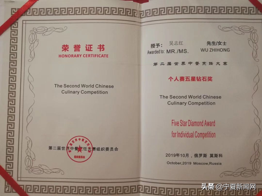 记者见到吴志红的时候,他刚参加完在俄罗斯举办的第二届世界中餐烹饪大赛,以《丰收玉米鱼》和宁夏菜《石榴羊肉》摘得两枚五星钻石金奖最高奖项。《石榴羊肉》采用的正是宁夏羊肉的烹饪方法。截至目前,吴志红已经荣获五次国际大奖。2005年参加马来西亚世界金厨大赛获两枚特金奖,同年获得中华金厨奖。