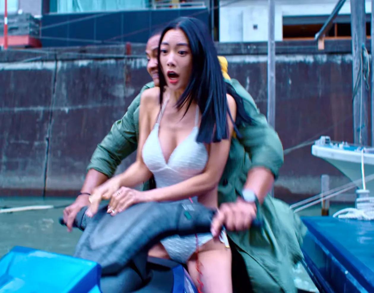 克拉拉在《唐人街探案3》钟客串比基尼美女,和托尼贾在水上摩托艇上飞驰。