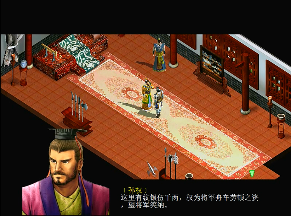 和文鹭对话完后,去成都下面和军需官对话,剧情跳转来到东吴住,赵云出使东吴,简简单单几句话就再次和东吴达成同盟,说正面一点就是赵云所说得到了孙权的肯定,反面就是这一段虚构的剧情有点水,达成同盟太简单,让玩家觉得有点不现实。