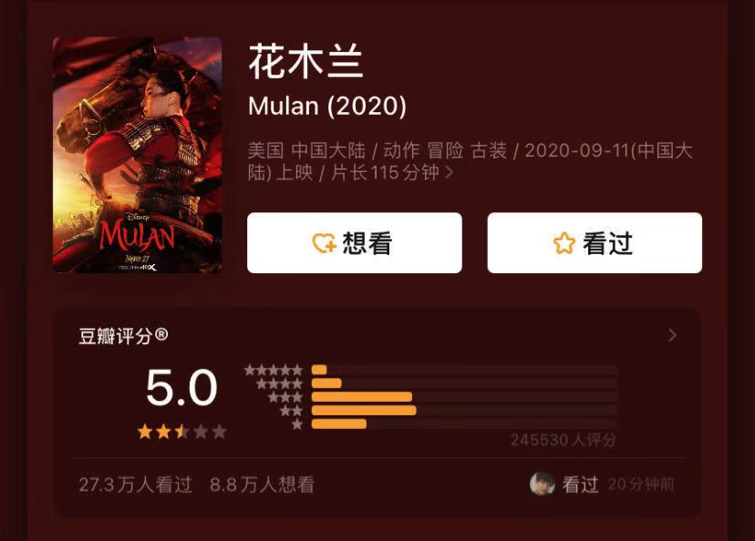 亏本不说,口碑也非常差,目前在豆瓣上《花木兰》的评分只有5分,连及格线都达不到。网友们从方方面面对这部大制作电影进行了点评,认为其无论是剧情、动作还是演技都毫无看点,不知道2亿美金到底花在了什么地方居然拍出这样一部毫无优点的电影,完全是在胡来。