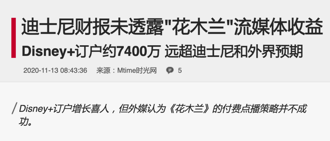 上个月迪士尼对外公布公司的第三季财报,截止9月30日流媒体disney+累计7370万订户,远超外界预期。然而对于《花木兰》采取的29.9美元高端点播,迪士尼ceo鲍勃·查伯克并未公布具体收益,闭口不谈也许是因为点播量不尽人意,不过不管在流媒体上如何挣扎,也无法改变《花木兰》血亏的结局。