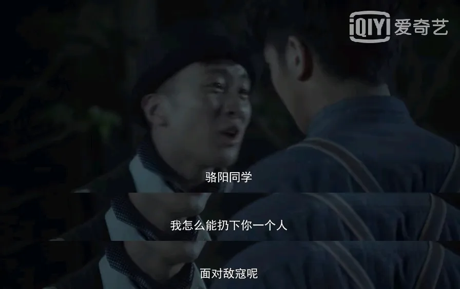 镜头切换到一行三人在躲避日本人追杀,一位女同志跑不动了,男主骆阳主动提出自己留下断后,这时,另一位男同志发话了: