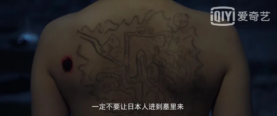 眼看日军就要找到古墓,古儿拜托骆阳一定不能让日本人得逞,并脱了衣服——古儿背后画有古墓的机关地形图。