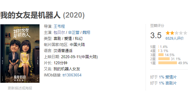 - 2020年《我的女友是机器人》 豆瓣评分:3.6