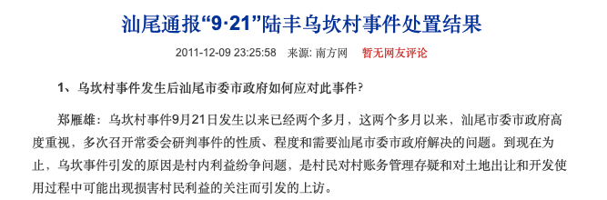 “到现在为止,乌坎事件引发的原因是村内利益纷争问题,是村民对村账务管理存疑和对土地出让和开发使用过程中可能出现损害村民利益的关注而引发的上访。”2011年12月,汕尾市曾通报“9·21”陆丰乌坎村事件处置结果。