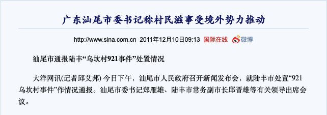 “境外的某些机构、势力和媒体与乌坎村事件确实有一定关系,把一个村的问题炒得沸沸扬扬,无限放大,已经跟村民的意愿相去很远。公安机关已发现有汕尾以外的人在事件中推波助澜、给钱、通风报信,帮忙印制标语等等行为。对于汕尾、陆丰两级党委政府,要守住的是法律的底线。”