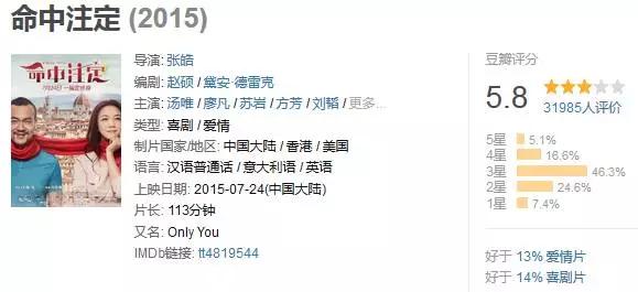 冯小刚监制的《命中注定》,更像是他握着年轻导演的手,一笔一划去认真临摹冯氏喜剧的半成品。影片中处处都有“冯氏特色”的影子,甚至在片中表现出色的廖凡和汤唯,也给人的感觉是一场《非诚勿扰》葛优和舒淇的模仿秀。
