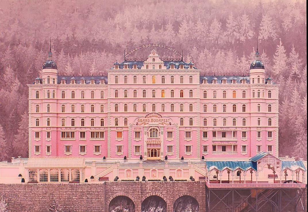 《布达佩斯大饭店》的主色调是淡粉色,影片中主要场景布达佩斯大饭店的外观也是以粉色为主。影片一开始,一个身着卡其色外套的女孩手抱着一本淡粉色的书走入观众的视野,她踏着白雪,走到《布达佩斯大饭店》作者的雕像前。接着镜头转向女孩手中粉色的书。在此时空中,背景里的白雪也略偏粉调。主色调的统一,使得影片整体基调有统一性,淡粉色的使用在全片营造出一种童话世界般的梦幻感。