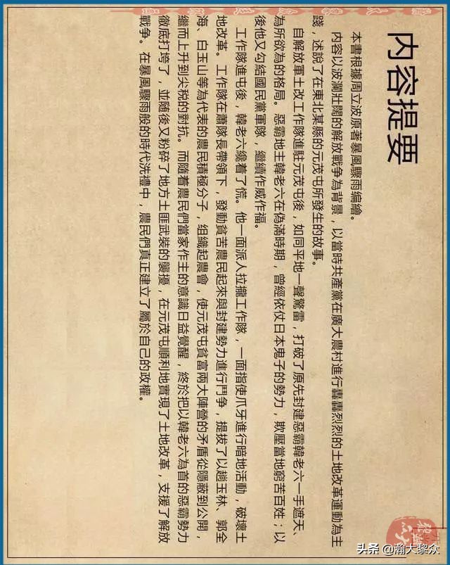 内容提要:本书根据周立波原著暴风骤雨编绘。内容以波澜壮阔的解放战争为背景,以当时共产党在广大农村进行轰轰烈烈的土地改革运动为主线,述说了在东北某县的元茂屯所发生的故事。自解放军土改工作队进驻元茂屯后,如同平地一声惊雷,打破了原先封建恶霸韩老六一手遮天,为所欲为的格局。恶霸地主韩老六在伪满时期,曾经依仗日本鬼子的势力,欺压当地穷苦百姓;以后他又勾结国民党军队,继续作威作福。工作队进屯后,韩老六纔着了慌。他一面派人拉拢工作队,一面指使爪牙进行暗地活动,破坏土地改革。工作队在萧队长带领下,发动贫苦农民起来与封建势力进行斗争,提拔了以赵玉林、郭全海、白玉山等为代表的农民积极分子,组织起农会,使元茂屯贫富两大阵营的矛盾从隐蔽到公开,继而上升到尖锐的对抗。而随着农民们当家作主的意识日益觉醒,终于把以韩老六为首的恶霸势力彻底打垮了,并随后又粉碎了地方土匪武装的袭扰,在元茂屯顺利地实现了土地改革,支援了解放战争。在暴风骤雨般的时代洗礼中,农民们真正建立了属于自己的政权。