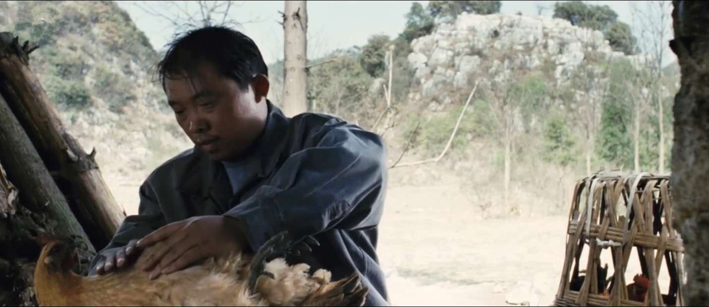 从此,他像唐吉诃德,骑上摩托,独自上路......影片很少地方有配乐,但这里有两个长镜头和蒙古音乐,一个镜头是老铁骑着摩托从远处过来,另一个是远景的群山和蜿蜒的盘山公路,老铁和他的摩托变得很小,一种隐约的西部片气质,老铁像是成了西部片里的孤胆英雄和复仇者,但电影同时又是反这种气质的,很多地方都在告诉你,老铁只是一个普通的农民,甚至活得很压抑和失败,在影片的开头,债主上门催债,他很不耐烦地抓了一头家里的小猪仔,扔到了债主的手上,不说一句话,他老婆跟债主说:你就看着办能抵多少钱吧。