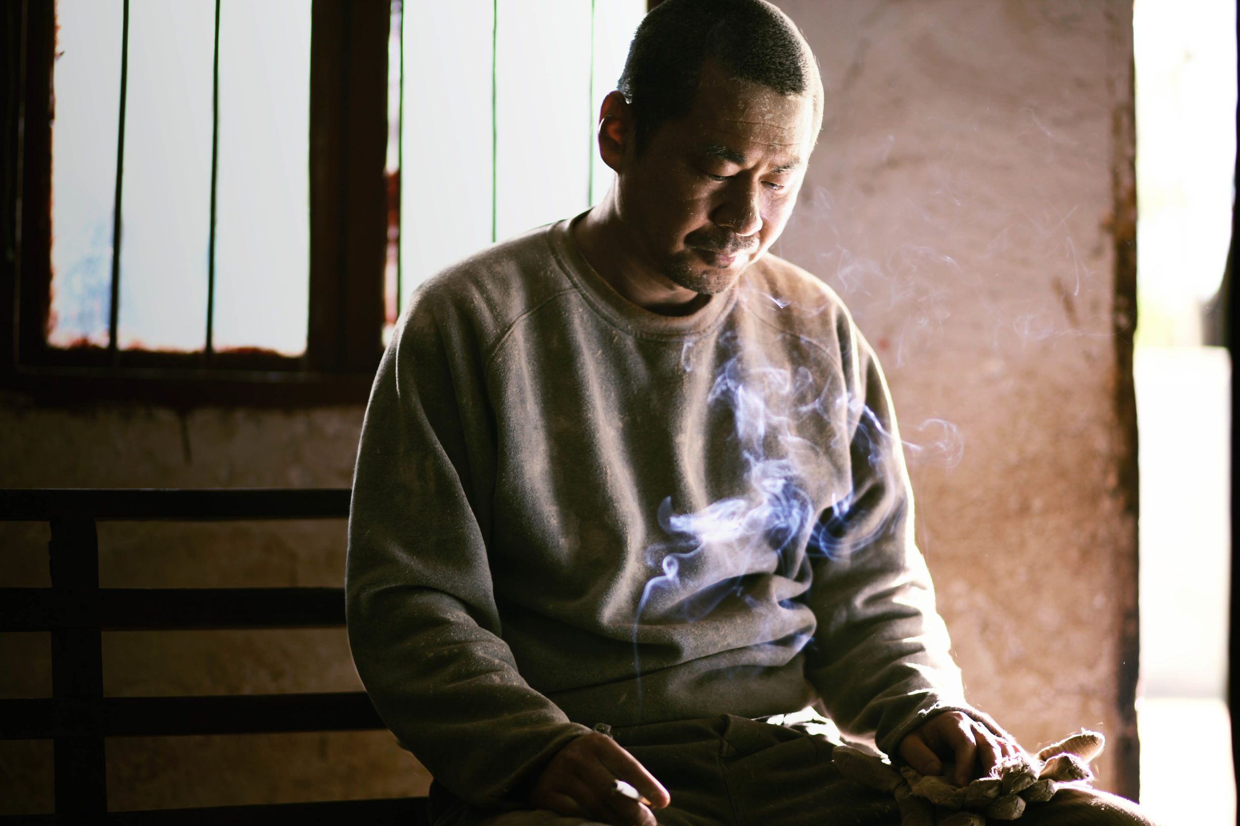 第一个镜头,陈建斌饰演的老铁,坐在长条凳上屈身向前,脸对着门外抽烟,阳光打在他的脸上,胡子拉渣,看上去一脸的呆滞木讷,一个沉默寡言的人,但内心坚定,烟雾在阳光下缭绕,他说了一句话:老二被杀是他的命,而为他报仇是我的命。