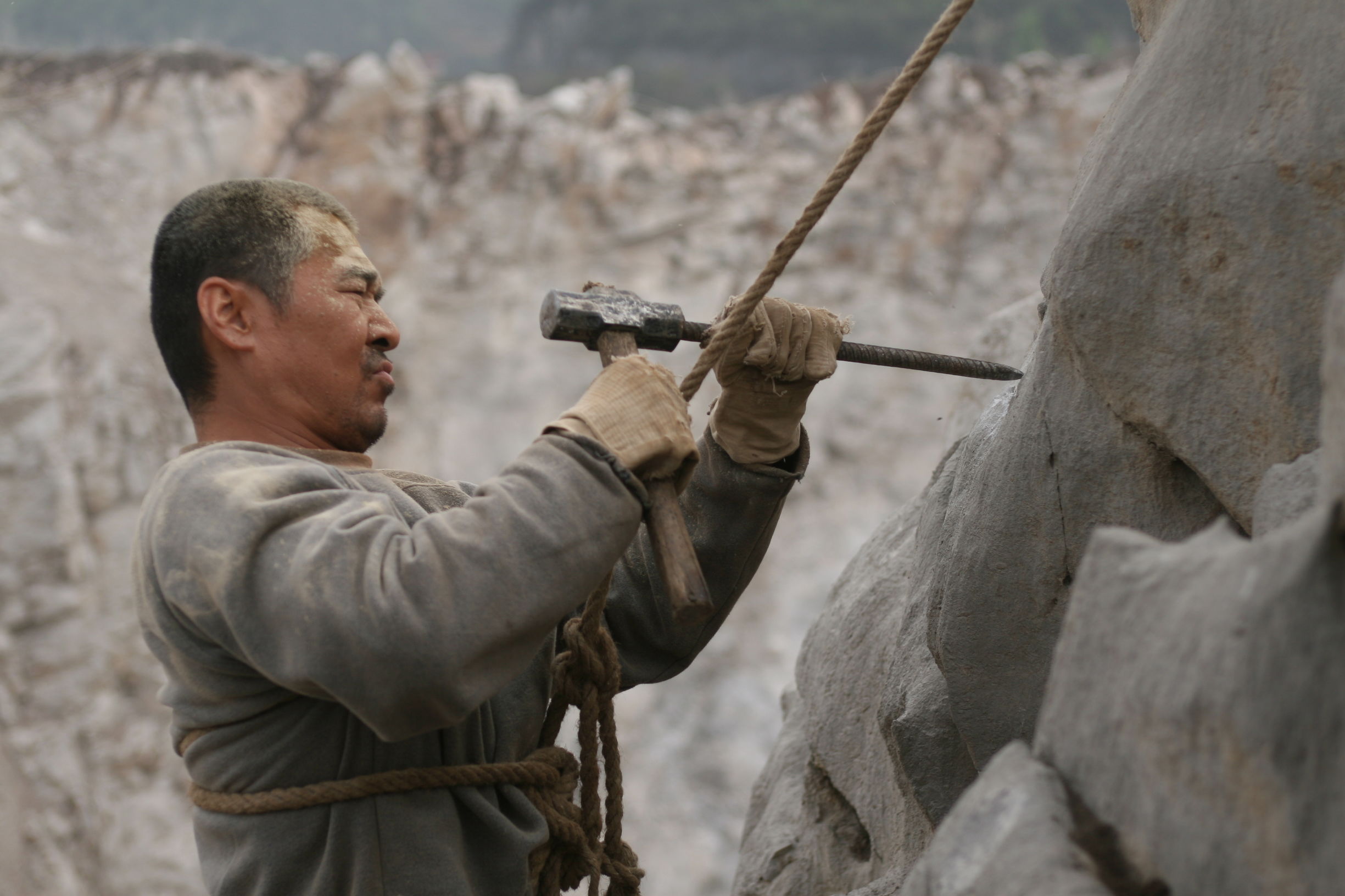 千山万水走遍,看够了别人的生活,老铁回来了,影片结尾他到山上采石头,身子挂在峭壁上,紧皱着眉,一小锤一小锤地击打在石壁上,像是宿命(我看的是公映版,据说电影节版不是这样的结尾,没看过,暂且不评论)。