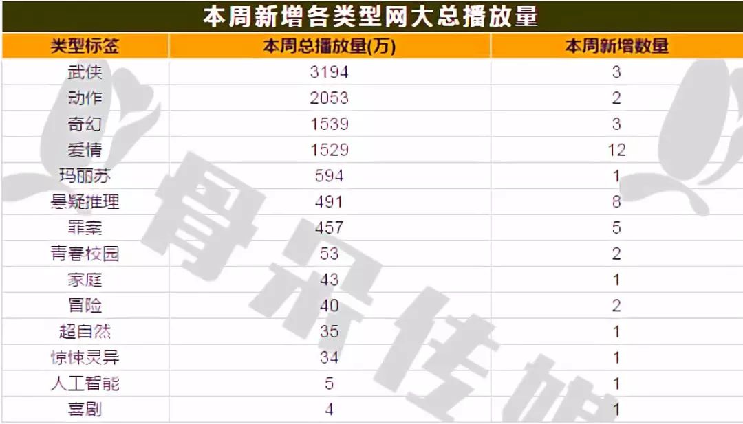 第25周新增网大类型共14个,“爱情”类网大在数量上仍旧占据优势地位,本周上线12部,总播放量也达到了1529万。在本周的数据流量上,“武侠”类型网大虽然只上线了3部,但数据却达到3194万,平均数据相当可观,稳居第一。除此之外,网大类常见的“喜剧”类型作品,在本周只上线了1部,播放量也仅达到4万。