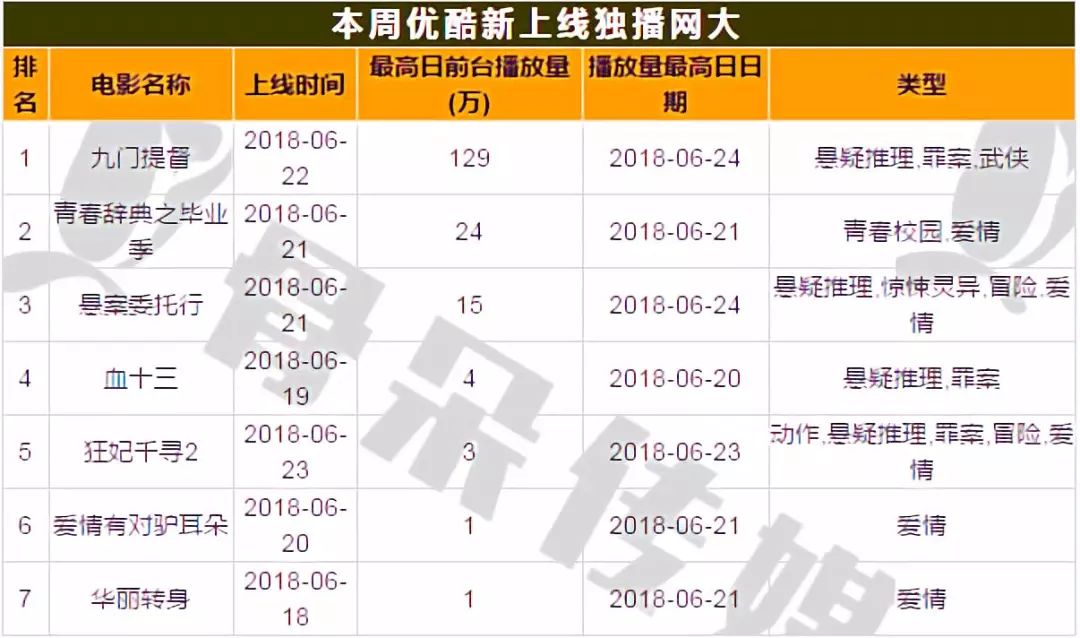 本周优酷共上新7部网大作品,数量与上周持平,在流量上,本周优酷的首日前台播放量仅165万,较上周减少509万。在类型上以“悬疑推理”“爱情”“罪案”较多。本周优酷新上线网大中,最高日前台播放量超过100万的仅有一部,是武侠类电影作品《九门提督》,该片也是一部网院同映作品,勾画了一个东方美学武侠世界。
