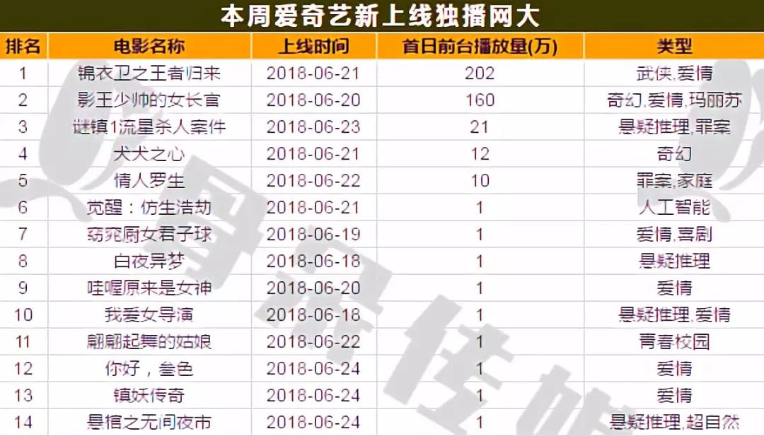 本周榜单中,腾讯视频入围4部影片;爱奇艺入围5部影片;优酷入围1部影片。