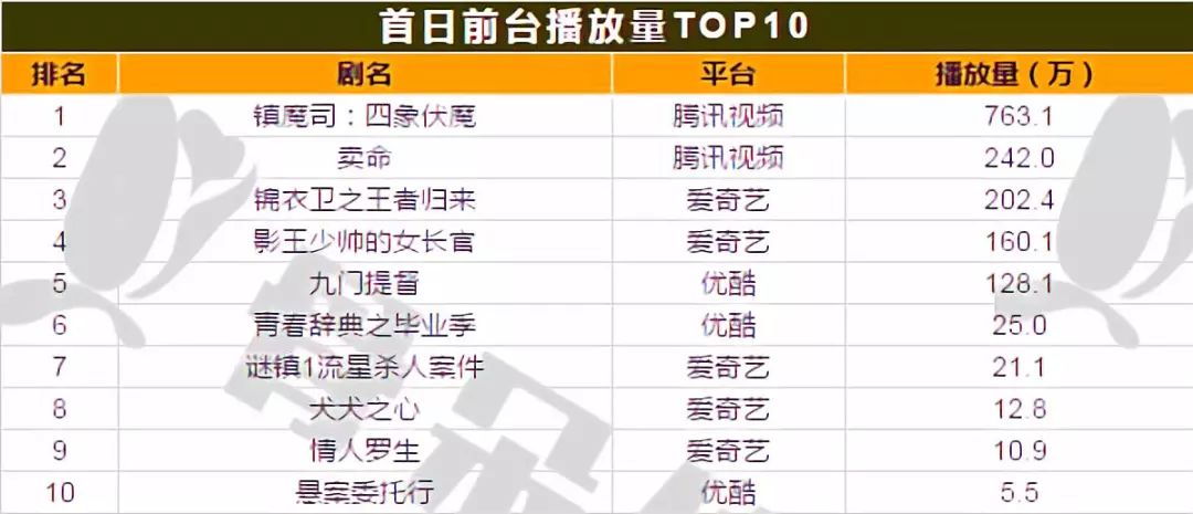 在新上网络电影首日前台播放量top10中,《镇魔司·四象伏魔》以763.1万的首日播放量占据第一名;《卖命》以242万的首日前台播放量占据榜单第二名;《锦衣卫之王者归来》以202万的首日前台播放量占据第三名。