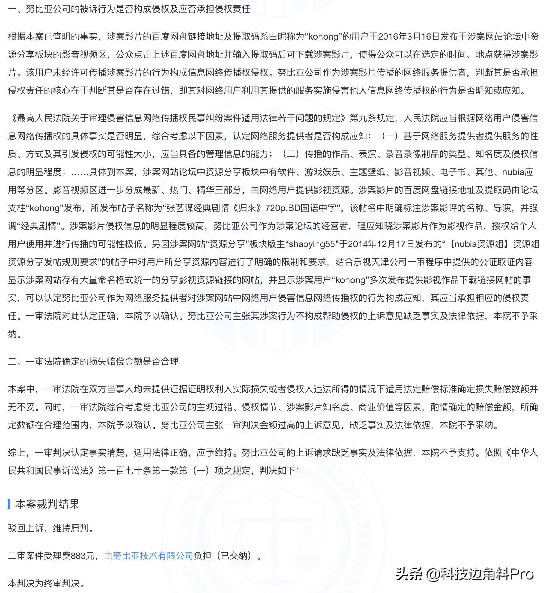 ?努比亚辩称涉案论坛版块内容均为注册用户即网友上传,努比亚未直接提供涉案作品且未对网友上传侵权作品的行为提供帮助,故未对涉案作品构成侵权。