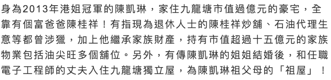 ▲ 出身富貴家庭的她,父亲从事五金生意,19岁时她就获赠了两间豪宅,19年宣布婚讯后再次以个人名义购入物业。
