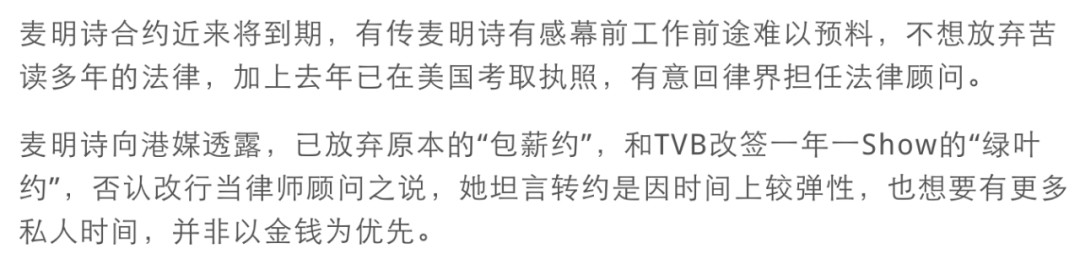 这三位,一位是出身中产的所谓“十优港姐”麦明诗,还有一位出身富贵的美貌港姐朱千雪,都是法学高材生,选美之后全部因为收入低而回归法律界,但因为选美造就的名气,也们在法律界起步相对来说就会较高,可以完成心愿,完结明星梦,二可以混得脸熟,拥有名气,在这个流量即现金的时代里,这么一举两得的事,何乐而不为。