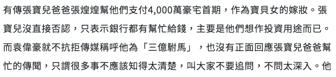 ▲ 不过港媒很酸地称袁伟豪为“三亿驸马”,据说女方父亲直接出了4千万头期款,爱女情深,只要女儿开心就好。